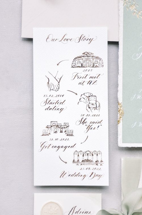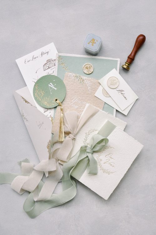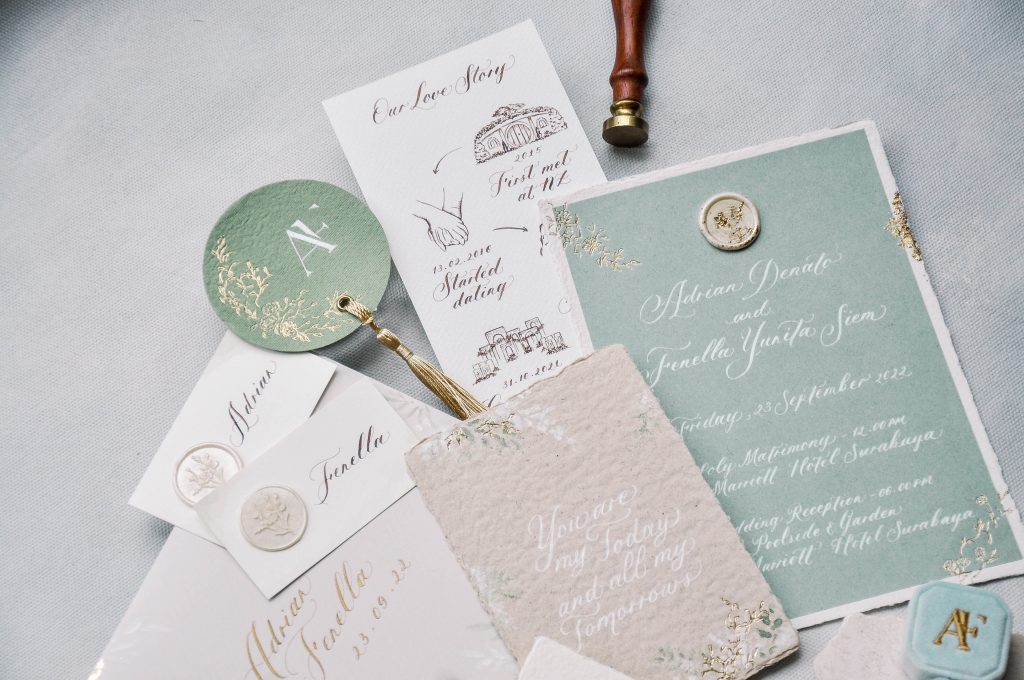 Adrian & Fenella’s wedding is using green color as its main with neutral color as accent. We combine the use of sage green card stock on off-white handmade paper for the main invitation. The gold details on the invitation made the look more artsy and elegant. They also go for our morning details package with laurel & bone color for the vow books’ silk ribbon, which complement the invitation suite well. Not forgetting the love story card addition which never fails to bring warmth and fussy feeling to their keepsake set!