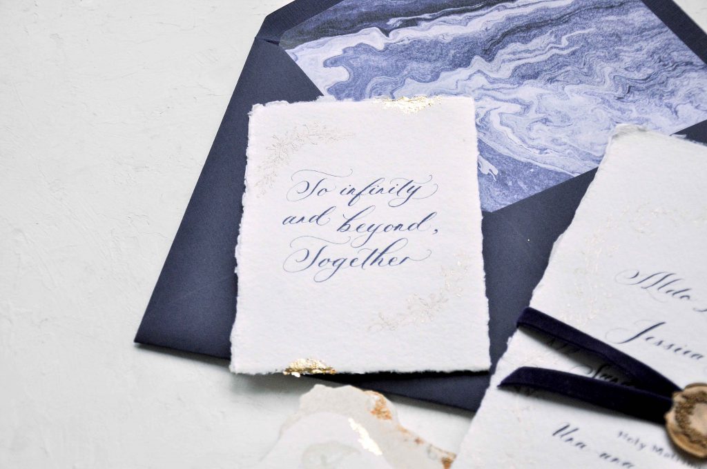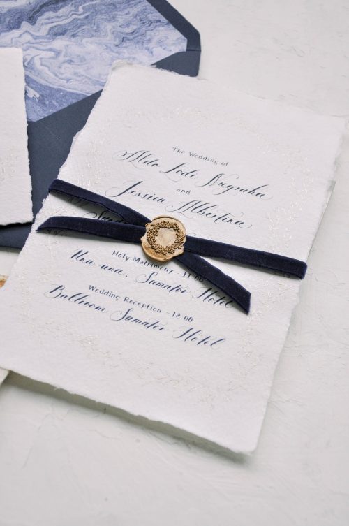 White, navy, and gold accent is what Aldo & Jessica keepsake about. We add a subtle gold floral frame to the invitation to create a elegant and clean look. Navy blue velvet ribbon and gold wax seal is added as a delicate finishing touch.