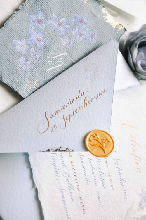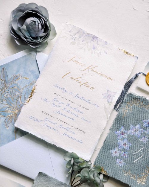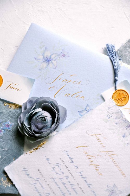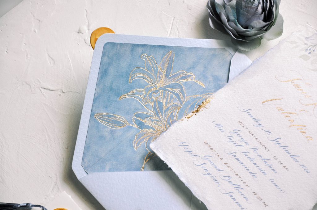 Faris & Valen loves the vibes of pastel blue color and floral accent. They want the overall look of the invitation is soft and sweet. We use gold ink for their names and dusty blue ink for the invitation detail. We give a little visual surprise on the envelope liner by adding water color background and hand-foiled flower at the top of it.