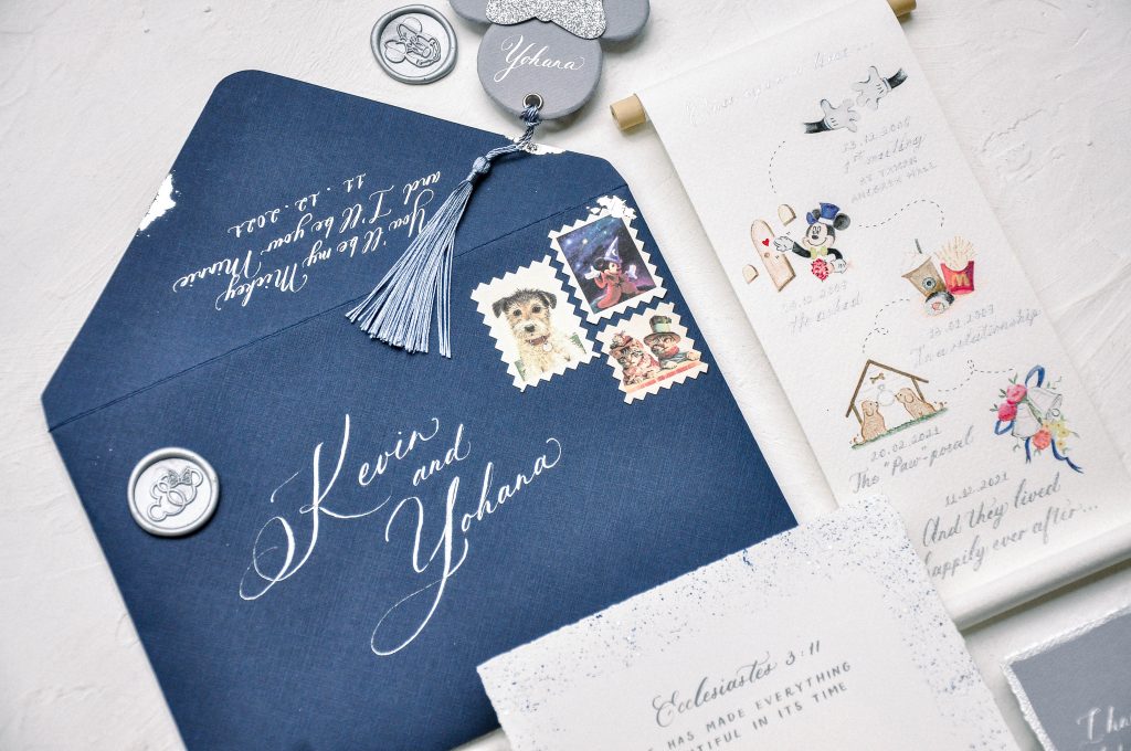 We use glitter paper as an envelope liner against the dark blue envelope to create a dramatic opening. Their love story card is presented as a scroll to add more “dreamy” mood to this suite. A disney castle in water color painting, mickey and minnie wax seal makes this suite look cohesive and sweet at the same time.