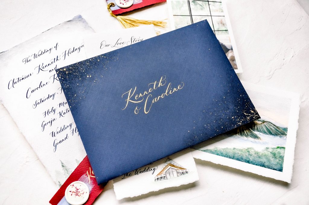 Kenneth and Caroline has a vibrant and colorful wedding palette. Mount Bromo is where they had their proposal and definitely became their memorable place. The main invitation comes in bright color with trees water color, while the envelope is resmbling a night sky full of stars.