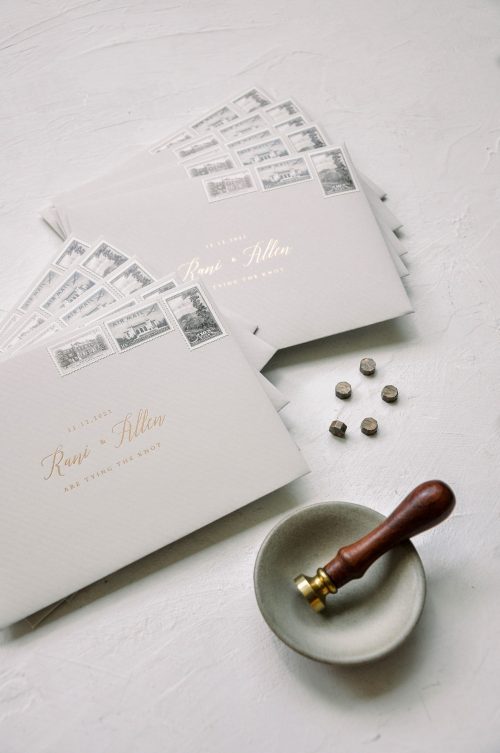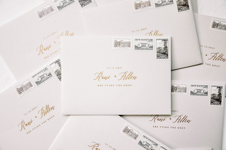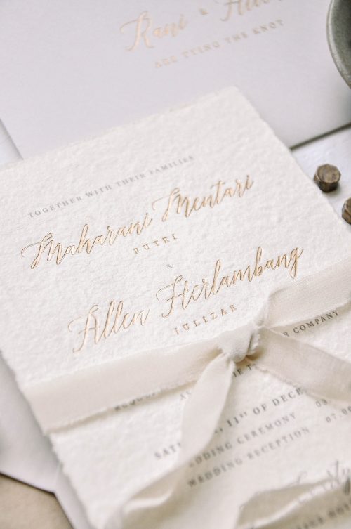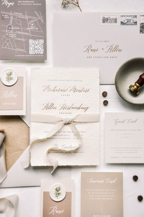 Rani & Allen’s wedding is covered in earthy tone. We use color like neutral white, cream, khaki, and some shades of brown through the stationery pieces